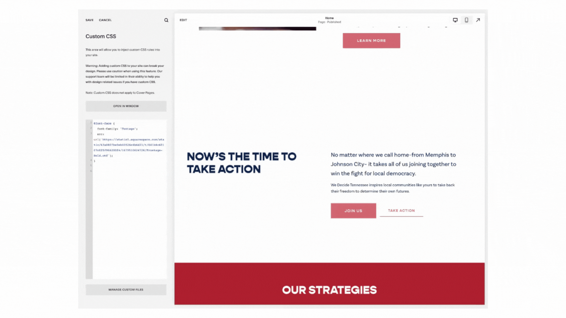 To upload a custom font of your own, navigate to the Design tab, then click into Custom CSS. From here, click Manage Custom Files and upload or drag and drop your font file. To view the URL for that file, click the file name and Squarespace will add the URL link into the Custom CSS dialog box.